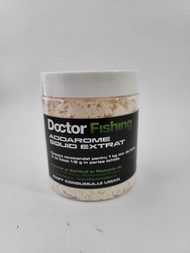 Addarome Squid powder de la este un extract super-concentrat cu totul special. Este obtinut printr-o tehnologie inovatoare unica, care utilizează Talin ca purtător electrostatic pentru compușii aromatici organici și aminoacizii care alcătuiesc aroma și atractantul. Talin este un ingredient pur natural utilizat in scop sensorial, find folosit ca agent de intensificare a aromei si totodata ca agent sinergic ce imbunatateste performanța produselor aromatizante , avand in acelasi timp si rol de indulcitor. Addarome Squid asigura absorbtia maxima a nadei de catre crap datorita stimularii in exces a apetitului. Este unul din ingredientele cheie folosite in boiliesurile destinate competitiilor. La baza formulei acestuia se afla un conglomerat perfect echilibrat de uleiuri esentiale, oleoresine, acizi organici, esteri si aminoacizi.